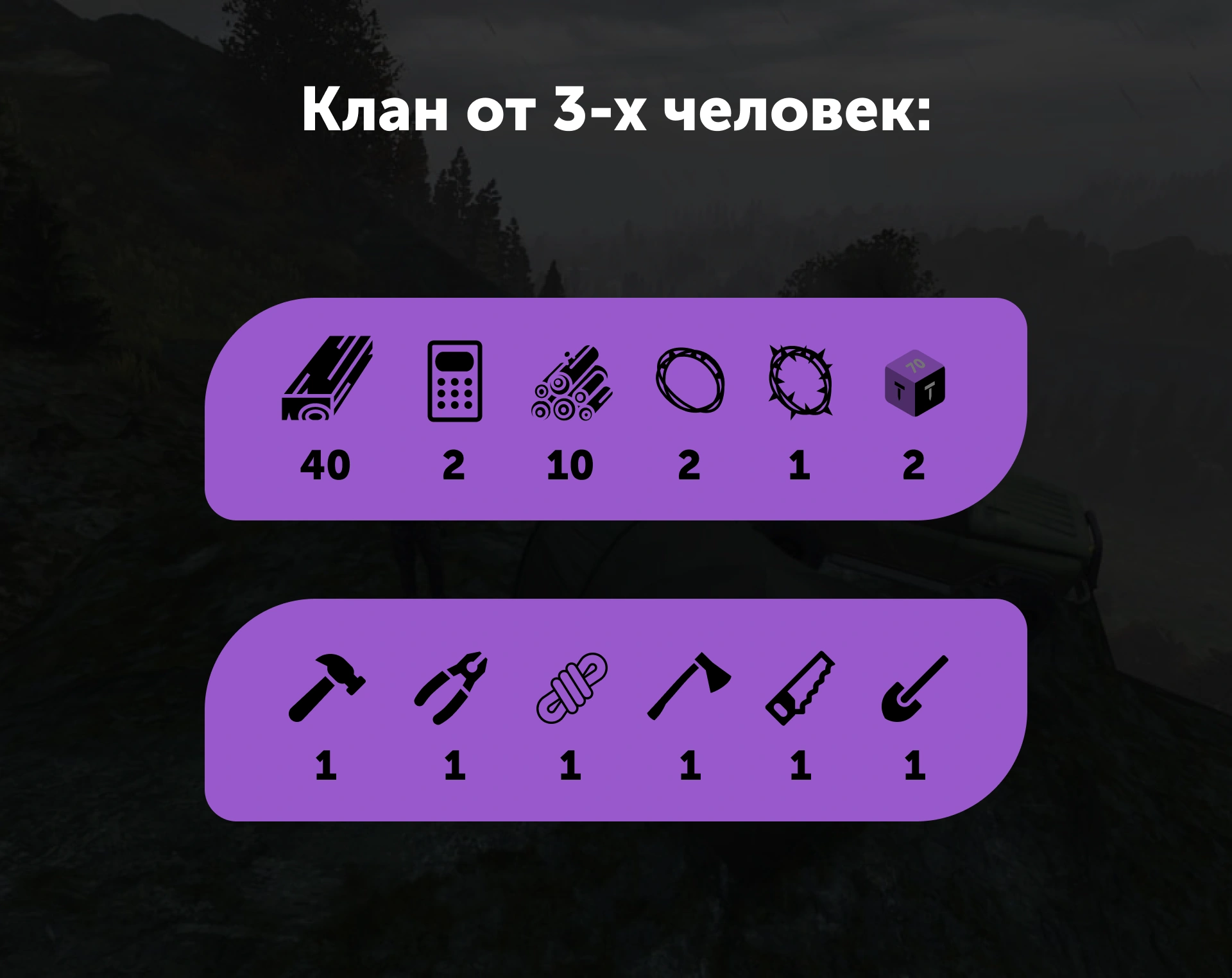 | 40 досок | 2 кодлока | 2 проволоки | 10 бревен | 1 лопата | 1 плоскогубцы | 1 топорик | 3 пачки гвоздей | 2 веревки | 2 точильных камня | флаг |