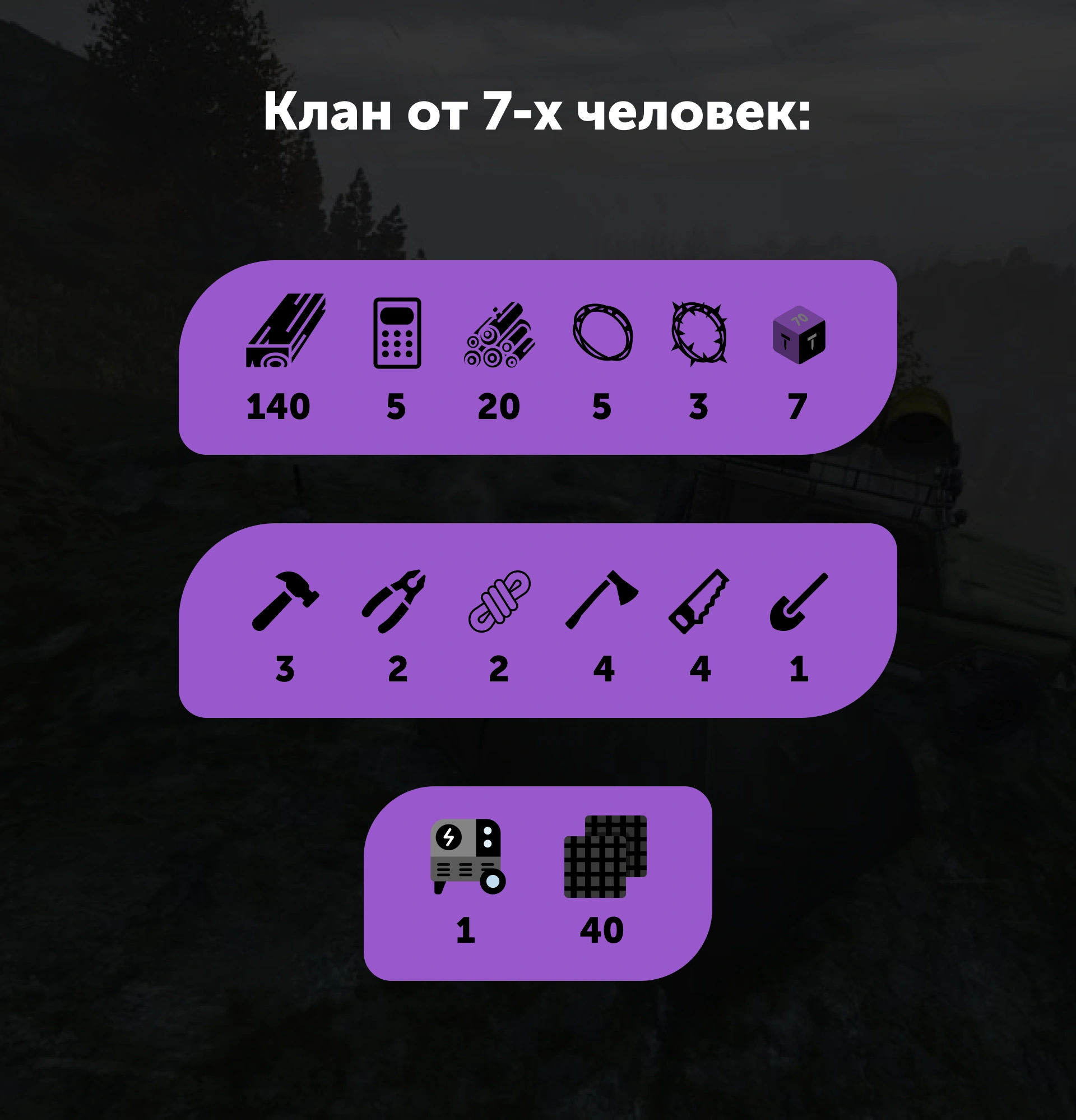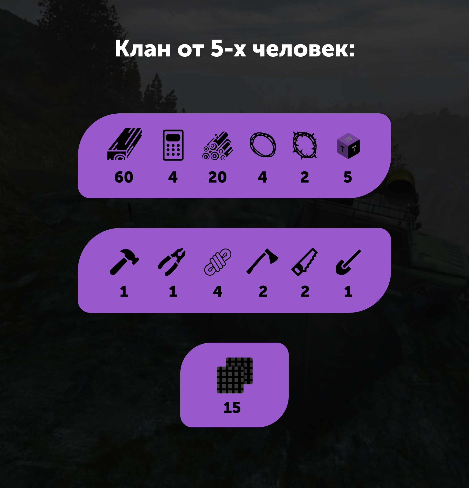 | 60 досок | 4 кодлока | 4 проволоки | 20 бревен | 1 лопата | 1 плоскогубцы | 2 топорика | 5 пачек гвоздей | 4 веревки | 4 точильных камня | флаг | 2 пилы | 1 молоток |